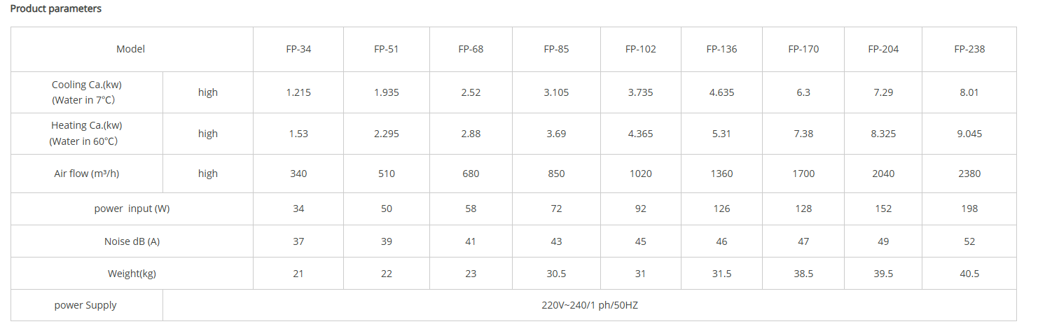 Once the load is calculated, choose a unit with a cooling capacity that matches or exceeds this requirement. For example, the FP-170 model provides a cooling capacity of 6.3 kW. You would need approximately 5 to 6 units to meet the total load of 34 kW.